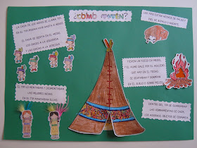 Y por otro lado les pedimos su colaboración a la hora de elaborar "El libro colectivo". Cada niño se ha llevado a casa una hoja en A3 con un aspecto a investigar sobre los indios. Pueden pegar dibujos, hacer manualidades, escribir alguna frase o palabra... Eso sí, todo lo que aparece en esa hoja los niños deben ser capaces de contárnoslo en la asamblea. De esta manera vamos a aprender muchas cosas de los indios y lo más importante unos de otros.